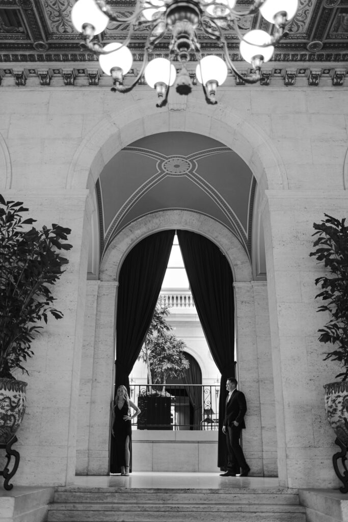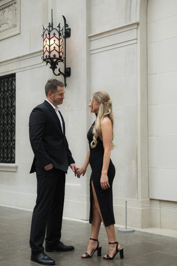 In Edwards Court during their Columbus Museum of Art engagement session they walked and laughed under the gorgeous glass ceiling. The room was surrounded by the beautiful marble walls and red drapes.