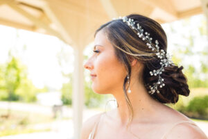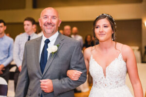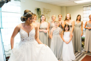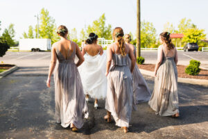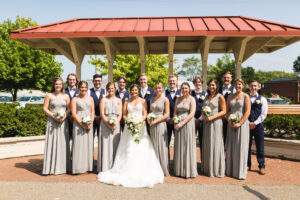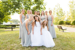 Stephanie & the girls got The Makoy Center Summer Wedding ready at Penzone Salon in Dublin, Ohio. They wore custom satin robes and were treated like royalty at Penzone. When they arrived at The Makoy Center, the bridesmaids dressed in soft grey, floor-length dresses and the groom and groomsmen wore on navy suits. Aaron wore a floral tie while his groomsmen wore silver bow ties. Stephanie wore a flattering white, floor-length dress with a lace bodice and train from White of Dublin. It fit her perfectly, and her updo from Penzone flattered the neckline gorgeously.
